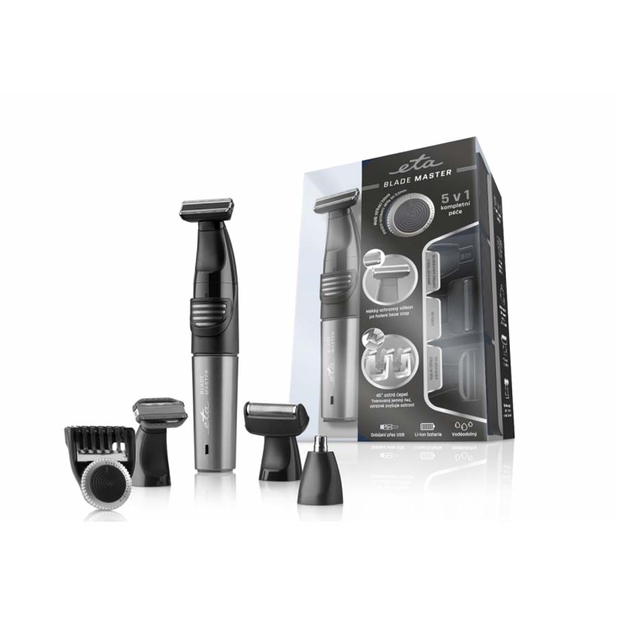 Η αλλαγή αξεσουάρ είναι γρήγορη και εύκολη. Στη συσκευασία θα βρείτε 5 διαφορετικά εξαρτήματα για όλα τα μέρη του σώματος. Χάρη στην μπαταρία ιόντων λιθίου 3,2 V, το ETA Blade Master θα λειτουργεί για έως και 60 λεπτά και θα φορτίζεται πλήρως σε μόλις 2 ώρες. Μια φωτεινή ένδειξη θα σας ενημερώσει για την κατάσταση φόρτισης και λειτουργίας. Η φόρτιση πραγματοποιείται έξυπνα μέσω του καλωδίου USB που περιλαμβάνεται στη συσκευασία.