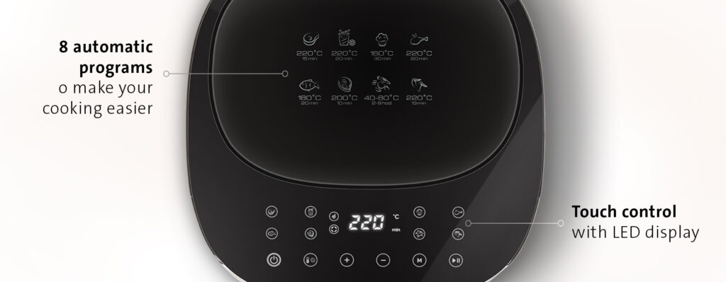 Η φριτέζα είναι εξαιρετικά εύχρηστη – η οθόνη αφής με οθόνη LED σας παρέχει όλες τις απαραίτητες πληροφορίες. Και με το εσωτερικό φως, μπορείτε να δείτε τι συμβαίνει στο εσωτερικό – είτε η κόρα είναι χρυσαφένια είτε οι πατάτες είναι ομοιόμορφα ψημένες.