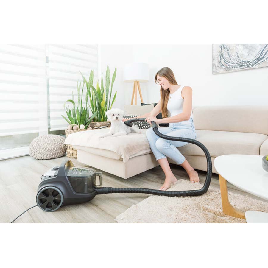 Ο περιστρεφόμενος μπροστινός τροχός 360° εξασφαλίζει την ομαλή λειτουργία κατά τον καθαρισμό. Η ακτίνα δράσης των 9 μέτρων εξασφαλίζει πρόσβαση σε όλες τις γωνίες των συνηθισμένων νοικοκυριών και το καλώδιο τροφοδοσίας τυλίγεται αυτόματα με το πάτημα ενός κουμπιού.
