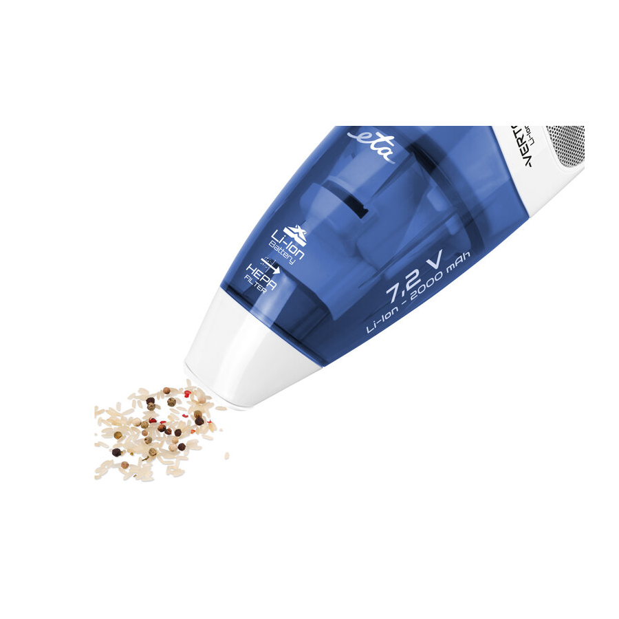 Η φορητή ηλεκτρική σκούπα χειρός ETA Verto Li-ion μπορεί να χειριστεί τόσο την ξηρή βρωμιά όσο και τα υγρά . Απορροφά σκόνη και ψίχουλα, καθώς και υγρά όπως νερό ή χυμένο γάλα. Και τα δύο ταξιδεύουν σε δοχείο που συγκρατεί έως 500 ml σκόνης ή 120 ml υγρών .